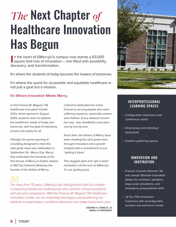 For more than 70 years, GMercyU has distinguished itself as a leader in preparing healthcare professionals who combine clinical excellence with genuine compassion. With the Frances M. Maguire’ 55 Healthcare Innovation Center, we are extending that legacy and positioning our students to meet today’ s workforce demands and shape tomorrow’ s care.