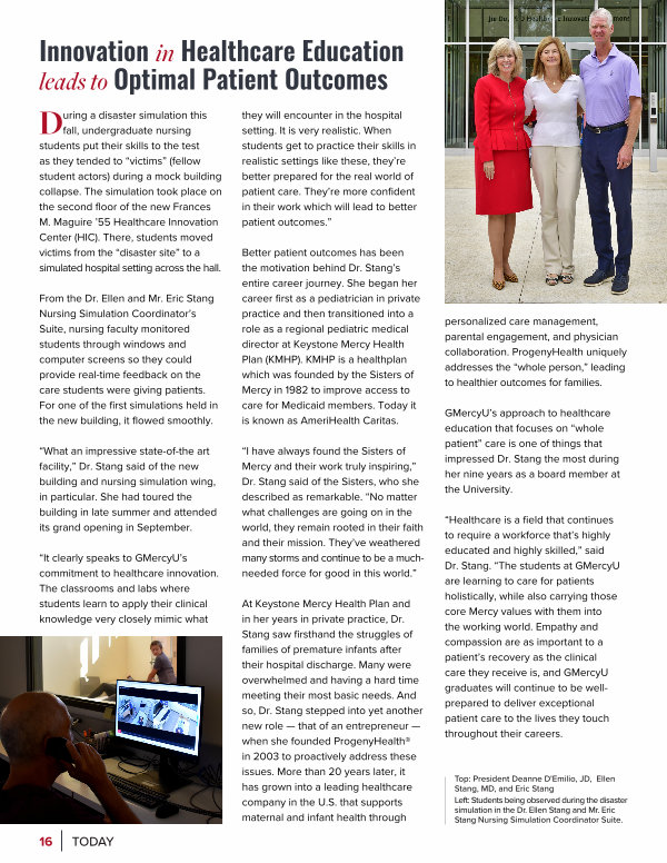 “ Healthcare is a field that continues to require a workforce that’ s highly educated and highly skilled,” said Dr. Stang.“ The students at GMercyU are learning to care for patients holistically, while also carrying those core Mercy values with them into the working world. Empathy and compassion are as important to a patient’ s recovery as the clinical care they receive is, and GMercyU graduates will continue to be wellprepared to deliver exceptional patient care to the lives they touch throughout their careers.