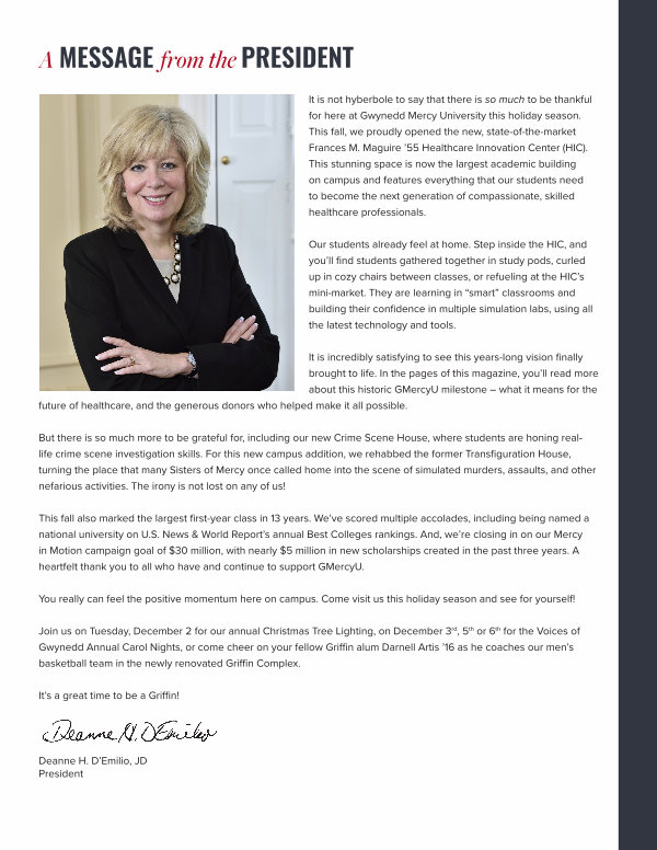 This fall also marked the largest first-year class in 13 years. We’ ve scored multiple accolades, including being named a national university on U. S. News & World Report’ s annual Best Colleges rankings. And, we’ re closing in on our Mercy in Motion campaign goal of $ 30 million, with nearly $ 5 million in new scholarships created in the past three years. A heartfelt thank you to all who have and continue to support GMercyU.