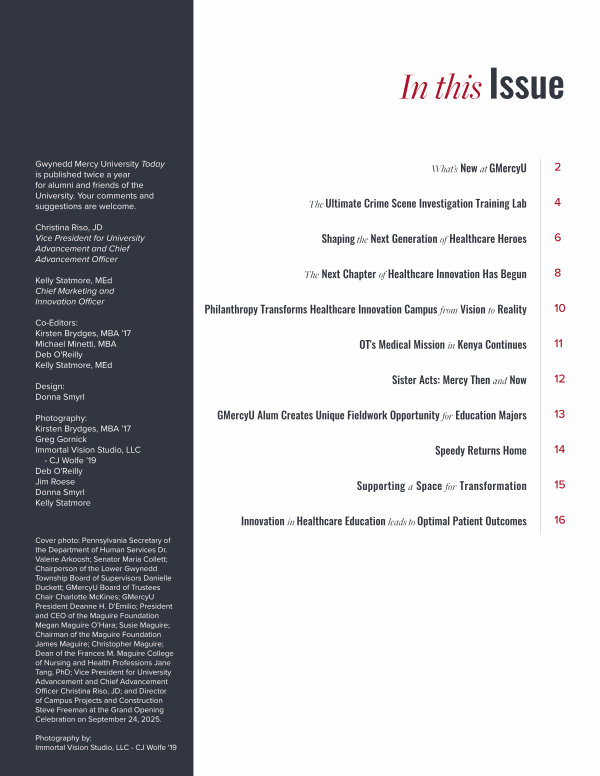 Cover photo: Pennsylvania Secretary of the Department of Human Services Dr. Valerie Arkoosh; Senator Maria Collett; Chairperson of the Lower Gwynedd Township Board of Supervisors Danielle Duckett; GMercyU Board of Trustees Chair Charlotte McKines; GMercyU President Deanne H. D ' Emilio; President and CEO of the Maguire Foundation Megan Maguire O’ Hara; Susie Maguire; Chairman of the Maguire Foundation James Maguire; Christopher Maguire; Dean of the Frances M. Maguire College of Nursing and Health Professions Jane Tang, PhD; Vice President for University Advancement and Chief Advancement Officer Christina Riso, JD; and Director of Campus Projects and Construction Steve Freeman at the Grand Opening Celebration on September 24, 2025.