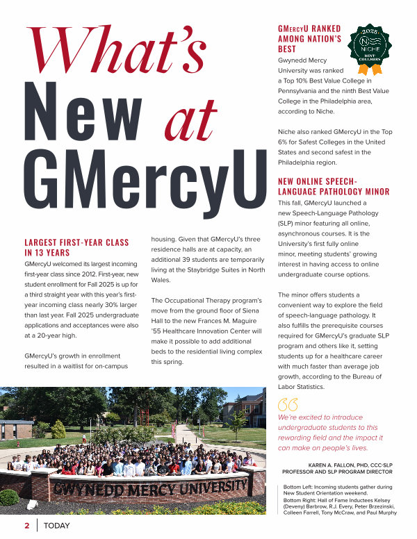GMercyU welcomed its largest incoming first-year class since 2012. First-year, new student enrollment for Fall 2025 is up for a third straight year with this year’ s firstyear incoming class nearly 30 % larger than last year. Fall 2025 undergraduate applications and acceptances were also at a 20-year high.