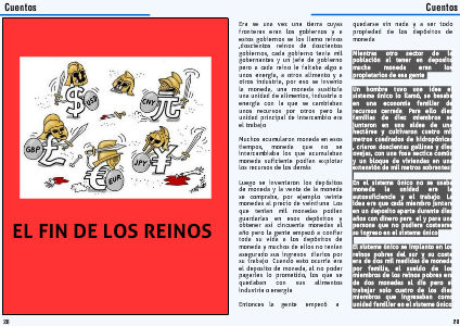Era se una vez una tierra cuyas fronteras eran los gobiernos y a estos gobiernos se los llamo reinos ,doscientos reinos de doscientos gobiernos, cada gobierno tenia mil gobernantes y un jefe de gobierno pero a cada reino le faltaba algo a unos energía, a otros alimento y a otros industria, por eso se invento la moneda, una moneda sustituía una unidad de alimentos, industria o energía con la que se cambiaban unos recursos por otros pero la unidad principal de intercambio era el trabajo.
