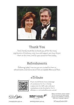 If you would like to leave a message of condolence for Tom ’ s family simply scan this QR code with your smartphone to be directed to Tom ’ s eTribute or visit bethelfunerals . com . au