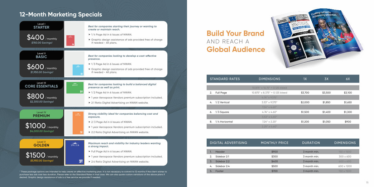 � 1 / 2 Page Ad in 6 Issues of NWAN. � 1 year Aerospace Vendors premium subscription included. � 2:1 Ratio Digital Advertising on NWAN website.