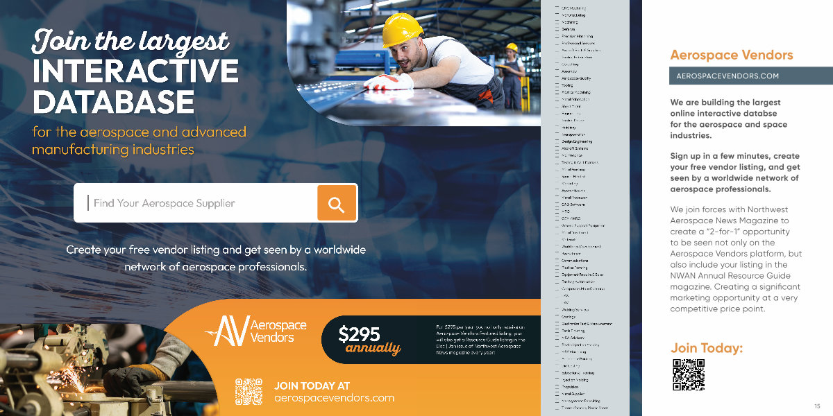 We join forces with Northwest Aerospace News Magazine to create a“ 2-for-1” opportunity to be seen not only on the Aerospace Vendors platform, but also include your listing in the NWAN Annual Resource Guide magazine. Creating a significant marketing opportunity at a very competitive price point.