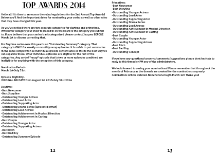 Hello all! It's time to announce the rules/regulations for the 2nd Annual Top Awards! Below you'll find the important dates for nominating your series as well as other rules that may have changed this year.