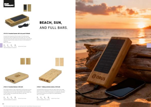 Powerbank med en kapasitet på 8.000 mAh, laget av FSC-sertifisert bambus. Powerbanken har også et solcellepanel slik at den kan lade i solen. Det er veldig enkelt å lade telefoner eller andre mobile enheter på farten på grunn av den kompakte størrelsen. Lad opptil tre enheter samtidig ved å koble den korrekte ladekabelen til powerbanken. Mål: 20 x 155 x 73mm