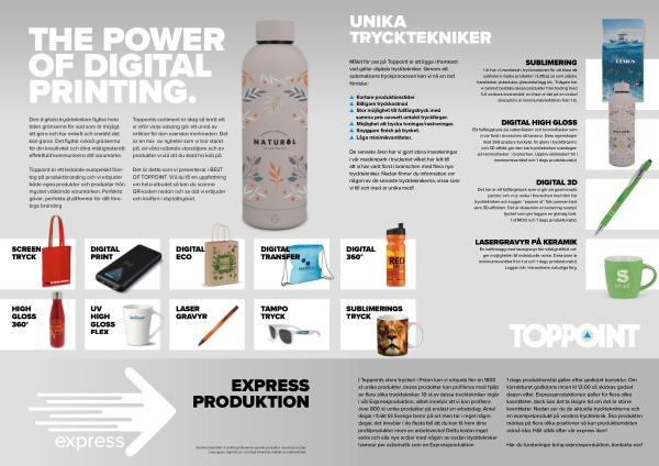 I Toppoints stora tryckeri i Polen kan vi erbjuda fler än 1800 st unika produkter, dessa produkter kan profileras med hjälp av flera olika trycktekniker. 10 st av dessa trycktekniker ingår i vår Expressproduktion, vilket innebär att vi kan profilera över 800 st unika produkter på endast en arbetsdag. Antal dagar i frakt till Sverige beror på ort men tar i regel några dagar, det innebär i de flesta fall att du kan få hem dina profilprodukter inom en arbetsvecka! Detta kostar inget extra och alla nya ordrar med någon av nedan trycktekniker hamnar per automatik som en Expressproduktion.