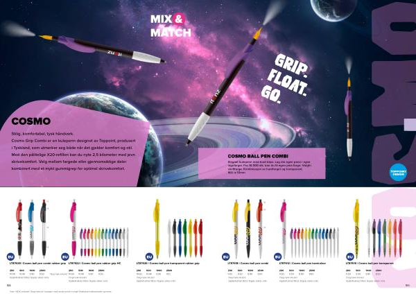 Stilig, komfortabel, tysk håndverk. Cosmo Grip Combi er en kulepenn designet av Toppoint, produsert i Tyskland, som utmerker seg både når det gjelder komfort og stil. Med den pålitelige X20-refillen kan du nyte 2,5 kilometer med jevn skrivekomfort. Velg mellom fargede eller gjennomsiktige deler kombinert med et mykt gummigrep for optimal skrivekomfort. LT87628 | Cosmo ball pen combi rubber grip LT87622 | Cosmo ball pen rubber grip HC