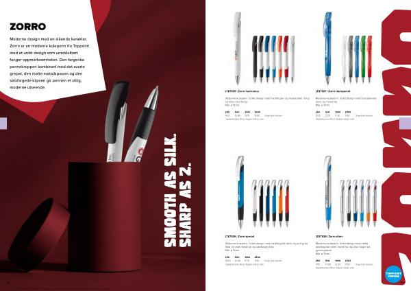 Moderne design med en slående karakter. Zorro er en moderne kulepenn fra Toppoint med et unikt design som umiddelbart fanger oppmerksomheten. Den fargerike pennekroppen kombinert med det svarte grepet, den matte metallspissen og den sølvfargede klipsen gir pennen et stilig, moderne utseende.