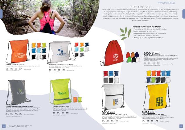 FORDELE VED VORES R-PET TASKER : - Fremstillet af 100 % genanvendte PET-flasker - Blødt , smidigt og let materiale - Sammenfoldelig , genanvendelig og holdbar - Fås i forskellige modeller og farver - Behagelig at bære , også over skulderen