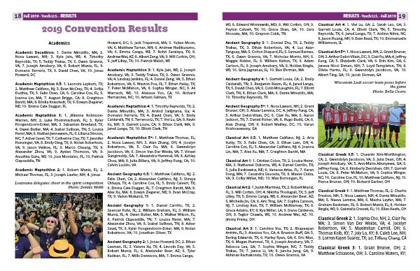 Classical Greek 2: 1. Sophia Cho, NH; 2. Clair Fu, MA; 3. Simon Van Der Weide, VA; 4. Jocelyn Robertson, VA; 5. Maximilian Carroll, OH; 6. Thomas Kolb, KY; 7. Joly Lo, KY; 8. Caleb Lee, NH; 9. Lorren Kayye Suarez, TX; 10. Tiffany Chang, CA