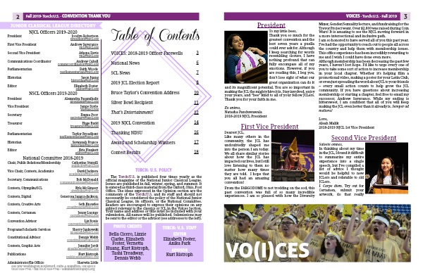 The Torch:U.S. is published four times yearly as the official magazine of the National Junior Classical League. Issues are published in fall, winter, spring, and summer. It is entered as third-class material from the Oxford, Ohio, Post Office. The ideas expressed in the Opinion section are the comments of the Torch:U.S. and its staff and should not necessarily be considered the policy of the National Junior Classical League, its officers, or the National Committee. Readers are encouraged to express their opinions on any subject relevant to the classics or JCL in the Voices Section. Your name and address or title must be included with your submission. All names will be published. Submissions may be sent to the editor or the advisor (see addresses to the left).