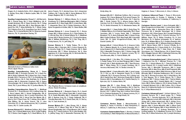 Certamen: Advanced Level: 1. Arham Salman, TX; 1. Domenic Ferreris, TX; 1. Jared Lange, TX; 1. Teddy Trakas, TX; 1. Timothy Reynolds, TX; 2. Ali Warraich, WI; 2. Benjamin Lorenz, WI; 2. Kyle Jain, WI; 2. Nicholas Chang, WI; 2. Niels Armbruster, WI; 3. Ashley Chou, MA; 3. Ben Ehrman, MA; 3. Clair Fu, MA; 3. Danny Nguyen, MA; 3. Dante Minutillo, MA; 3. Ethan Clark, MA; 3. Luc Azar-Tanguay, MA; 4. Anya AitSahlia, FL; 4. Benjamin Ream, FL; 4. Graham Bernstein, FL; 4. Lindsay Jenkins, FL; 4. Matthew Thomas, FL; 5. David Chen, VA; 5. Ethan Robertson, VA; 5. Joseph Amsbary, VA; 5. Owen Grannis, VA; 5. Simon Van Der Weide, VA; 6. Alexander Urquhart, NH; 6. Jason Huang, NH; 6. Kevin Xu, NH; 6. Nosa Lawani, NH; 7. Alazar Lemma, DC; 7. Lena Cavicchia, DC; 7. MJ Schmidt, DC; 7. Robert Mailley, DC; 8. Garrett Louie, CA; 8. Isabel Arroyo, CA; 8. Jeffrey Fung, CA; 8. Kiana Hu, CA; 9. Varun Krishnaswamy, GE; 9. Vineet Gangireddy, GE; 9. Vivi Lu, GE