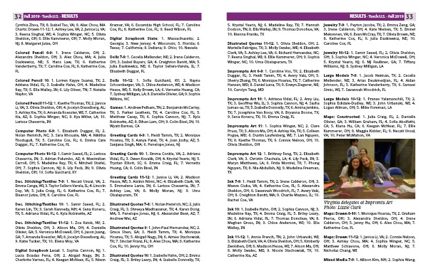 Dec. Stitching/Textiles 11-12: 1. Zoa Katok, NV; 2. Olivia Sheldon, OH; 3. Alison Ma, OH; 4. Danielle Olivier, GA; 5. Veronica McDowell, OH; 6. Jason Juang, GA; 7. Amanda Roessler, WI; 8. Jocelyn Dieselberg, AL; 9. Katie Tucker, TX; 10. Elena Moy, VA