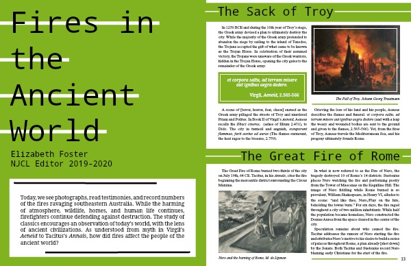 Today, we see photographs, read testimonies, and record numbers of the fires ravaging southeastern Australia. While the harming of atmosphere, wildlife, homes, and human life continues, firefighters continue defending against destruction. The study of classics encourages an observation of today’s world, with the lens of ancient civilizations. As understood from myth in Virgil’s Aeneid to Tacitus’s Annals, how did fires affect the people of the ancient world?
