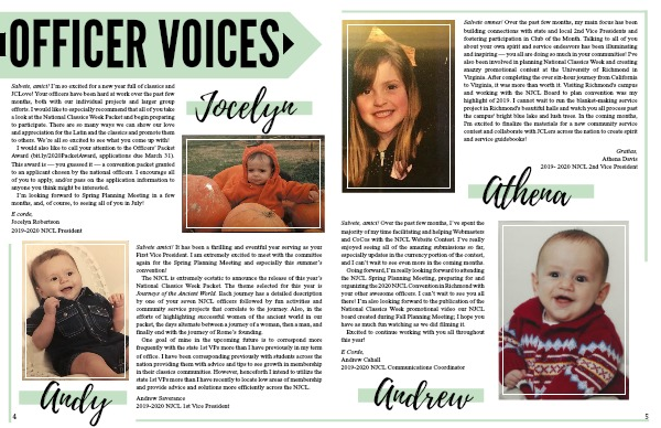 Salvete amici! It has been a thrilling and eventful year serving as your First Vice President. I am extremely excited to meet with the committee again for the Spring Planning Meeting and especially this summer’s convention!