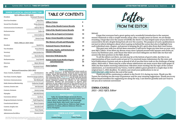 The Torch: U.S. is published four times yearly as the official magazine of the National Junior Classical League. Issues are published in fall, winter, spring, and summer. The ideas expressed in the Opinion section are the comments of the Torch: U.S. and its staff and should not necessarily be considered the policy of the National Junior Classical League, its officers, or the National Committee. Readers are encouraged to express their opinions on any subject relevant to the classics or JCL in the Voices Section. Your name and address or title must be included with your submission. All names will be published. Submissions may be sent to the editor or the advisor (see addresses to the left).