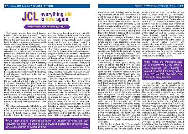 I was incredibly lucky and grateful to interview Sherwin Little, the president of the American Classical League (parent company of JCL). Speaking to Little about the JCL and Classics in general, it soon became obvious how important teachers were to the organization and community. One thing that struck out to me specifically was how much he spoke about the importance of being able to teach everyone. Specifically, Little said, “Y’know, really talking about throwing your classroom open for kids. Just because you learn differently doesn’t mean you can’t learn the same thing. You deserve to learn the same stuff. I was really happy about that... One of my proudest moments was we had a kid who started in the 1A class, did the 2A, we found a way- he got a 3 on the AP. And it’s like, he had the ability, we just had to help him sit through it and organize things and put things in a way he could understand. And as soon as he did it he was like ‘got it’.” Little may be the president of a giant organization, but many people forget that he was also a teacher. He loves the Classics, but even more so, he loves spreading the Classics to everybody. He spoke a lot about why the Classics should be accessible, and even shared an amazing story about a deaf student that found his own place in the Classics community (in Sicily nonetheless), “The one time we had a deaf student who traveled with us- he was in my AP class, wonderful kid, y’know he'd come to convention, done all kinds of things, he had his interpreter with him. And so, we're in Italy and y’know- all of us go out of this restaurant, and there's this group of Italian deaf students, and they were signing. Right away, I kinda looked at him and asked him if he understood. He said a little bit, he understood the letters signed. And he talked to them for like half an hour, and all of his friends were letting him stand there and enjoy the experience. I saw his mom at a parent teacher conference, and she said he talked to him nonstop.” It’s so incredibly important to be able to connect with people and Classics is a great way of doing it. They were speaking in Italian, but the AP student would have never had the opportunity to go on this trip and meet the students without the Classics. Little truly cares about the Classics and its opportunities that it provides. Because of teachers like Little, I am able to be involved with the Classics on such a deep level.