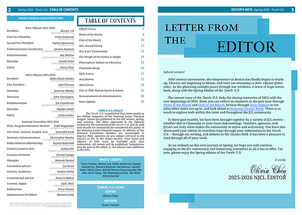 The newest issue of the Torch: U.S. links the closing memories of 2025 with the new beginnings of 2026. Here, you can reflect on moments in the past year through Photo of the Month and Club of the Month, browse through State Updates to see what other states are up to, and look ahead to National Classics Week. There is so much to explore both within this issue and throughout the JCL community.