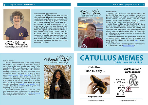 Winters almost over and It's definitely starting to warm up here in Georgia. I've been having a great time seeing and grading everyone's POTM submissions. Everyones been up to some fantastic things and I've had a great time at Classicalia meeting some of y'all. Just as a reminder, POTM submission dates are still at the end of every month (submit to the POTM contest here). The 2025 convention history has been finished and submissions for the NJCL art catalog are still open (I'm hoping to get this up soon)! This is a great opportunity to showcase your work so please consider submitting (submit to the catalog here). Additionally, the convention history guide will hopefully be up soon as well!