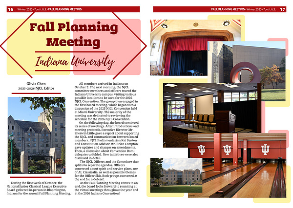 All members arrived in Indiana on October 2. The next morning, the NJCL committee members and officers toured the Indiana University campus, visiting various possible locations to be used for the 2026 NJCL Convention. The group then engaged in the first board meeting, which began with a discussion of the 2025 NJCL Convention held at Miami University. The majority of the meeting was dedicated to reviewing the schedule for the 2026 NJCL Convention.