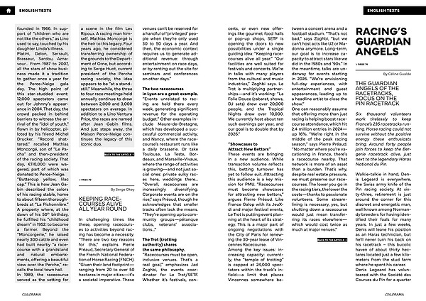 “ Showcases to Attract New Bettors” These events are bringing in a new audience. While transaction volume reflects this, betting turnover has yet to follow suit. Attracting this audience is a key mission for PMU.“ Racecourses must become showcases for attracting new bettors,” argues Pierre Préaud. Like France Galop with its JeuXdi and major festival events, Le Trot is putting event planning at the heart of its strategy. This is a major part of ongoing negotiations with the City of Paris for renewing the 30-year lease of Vincennes Racecourse. Among the key issues: increasing capacity: currently, the“ temple of trotting” is capped at 24,000 spectators within the track’ s infield— a limit that places Vincennes somewhere be- tween a concert arena and a football stadium.“ That’ s not bad,” says Zoghbi,“ but we can’ t host acts like U2 or Madonna anymore. Long-term, our goal is to increase capacity to attract stars like we did in the 1980s and’ 90s.” In the meantime, talks are underway for events starting in 2026.“ We’ re envisioning full-day experiences, with entertainment and guest appearances, leading up to a headline artist to close the show.” One can reasonably assume that offering more than just racing is helping boost racecourse attendance, which hit 2.4 million entries in 2024— up 16 %.“ We’ re right in the middle of the peak racing season,” says Pierre Préaud.“ No matter where you’ re vacationing in France, there’ s a racecourse nearby. That network is more of an asset than a burden. That’ s why, despite real estate pressure, we must preserve our racecourses. The lower you go in the racing tiers, the lower the costs— thanks to passionate volunteers. Some streamlining is necessary, yes, but shutting down a racecourse would just mean transferring its races elsewhere— which would cost twice as much at major venues.”