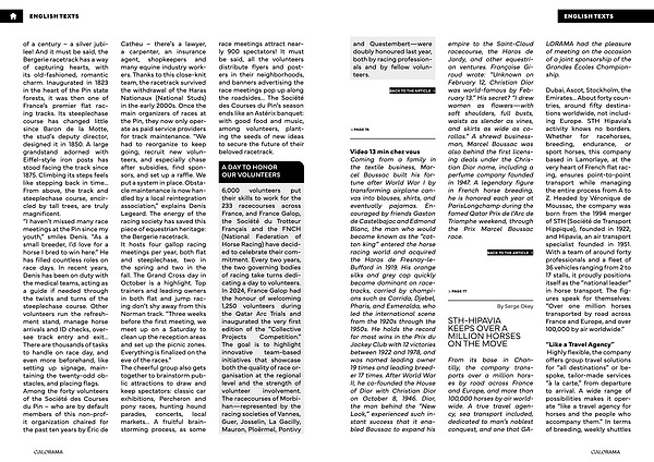 of a century – a silver jubilee! And it must be said, the Bergerie racetrack has a way of capturing hearts, with its old-fashioned, romantic charm. Inaugurated in 1823 in the heart of the Pin state forests, it was then one of France’ s premier flat racing tracks. Its steeplechase course has changed little since Baron de la Motte, the stud’ s deputy director, designed it in 1850. A large grandstand adorned with Eiffel-style iron posts has stood facing the track since 1875. Climbing its steps feels like stepping back in time... From above, the track and steeplechase course, encircled by tall trees, are truly magnificent.“ I haven’ t missed many race meetings at the Pin since my youth,” smiles Denis.“ As a small breeder, I’ d love for a horse I bred to win here.” He has filled countless roles on race days. In recent years, Denis has been on duty with the medical teams, acting as a guide if needed through the twists and turns of the steeplechase course. Other volunteers run the refreshment stand, manage horse arrivals and ID checks, oversee track entry and exit... There are thousands of tasks to handle on race day, and even more beforehand, like setting up signage, maintaining the twenty-odd obstacles, and placing flags. Among the forty volunteers of the Société des Courses du Pin – who are by default members of this non-profit organization chaired for the past ten years by Éric de