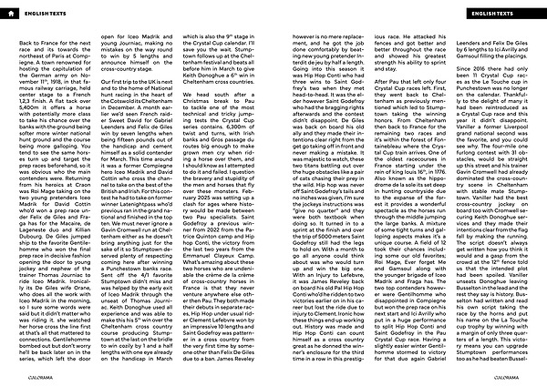 Our first trip to the UK is next and to the home of National hunt racing in the heart of the Cotswold its Cheltenham in December. A month earlier we’ d seen French raider Sweet David for Gabriel Leenders and Felix de Giles win by seven lengths when being fifteen pounds out of the handicap and cement himself as a solid contender for March. This time around it was a former Compiegne hero Iceo Madrik and David Cottin who cross the channel to take on the best of the British and Irish. For this contest he had to take on former winner Latenightpass who’ d previous ran in the grand national and finished in the top ten. We must never ignore a Gavin Cromwell run at Cheltenham either as he doesn’ t bring anything just for the sake of it so Stumptown deserved plenty of respecting coming here after winning a Punchestown banks race. Sent off the 4 / 1 favorite Stumptown didn’ t miss and was helped by the early exit of Iceo Madrik through the unseat of Thomas Journiac. Keith Donoghue used all experience and was able to make this his 5 th win over the Cheltenham cross country course producing Stumptown at the last on the bridle to win cozily by 1 and a half lengths with one eye already on the handicap in March which is also the 9 th stage in the Crystal Cup calendar. I’ ll save you the wait. Stumptown follows up at the Cheltenham festival and beats all before him in March to give Keith Donoghue a 6 th win in Cheltenham cross countries.