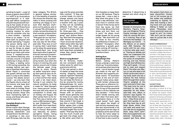 Making Sure Everything’ s Fine Before resting, Peltier’ s horses undergo a veterinary check-up,“ to avoid unpleasant surprises when resuming work – not all tendon issues are visible to the eye.” Dr. Gimenez also supports prebreak exams:“ A locomotor check at the end of training just makes sense, ideally with tendon ultrasounds. These give us reference images that could prove useful later. X-rays of the sesamoid bones in all four fetlocks are also valuable – if the horse didn’ t handle training well, we’ ll often find bone demineralization there or in the carpal bones.” Such signs help adjust the length of rest and any necessary care. She also recommends a full blood panel and ten days of probiotics at the start of rest to help the horse adapt to new food and surroundings. A fecal test is also crucial to determine if deworming is needed and which drug to use.