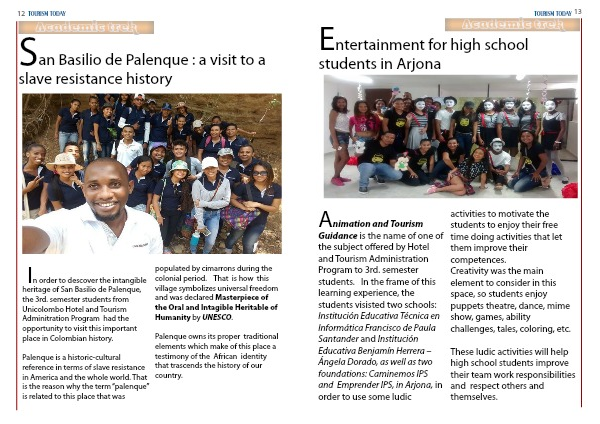 Animation and Tourism Guidance is the name of one of the subject offered by Hotel and Tourism Administration Program to 3rd. semester students. In the frame of this learning experience, the students visisted two schools: Institución Educativa Técnica en Informática Francisco de Paula Santander and Institución Educativa Benjamín Herrera – Ángela Dorado, as well as two foundations: Caminemos IPS and Emprender IPS, in Arjona, in order to use some ludic activities to motivate the students to enjoy their free time doing activities that let them improve their competences.