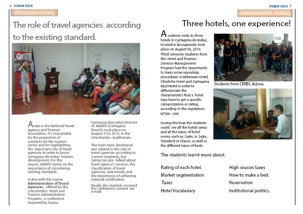In line with the course Administration of Travel Agencies offered by the Unicolombo Hotel and Tourism Administration Program, a conference imparted by Karina Santacruz, Executive Director of ANATO (Cartagena branch) took place on August 31st, 2016, in the Unicolombo Auditorium.