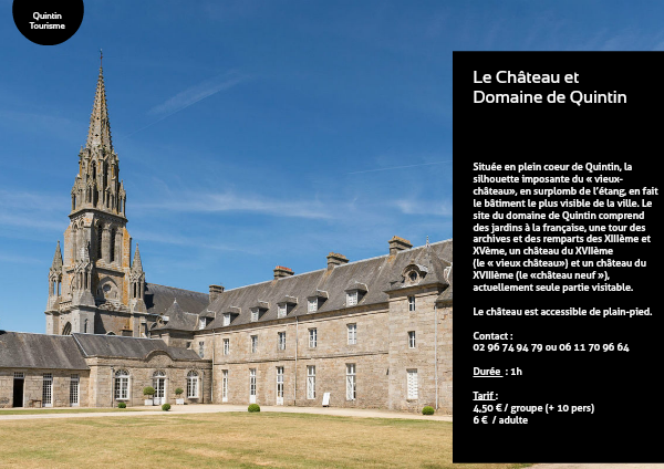 Située en plein coeur de Quintin, la silhouette imposante du « vieux-château», en surplomb de l’étang, en fait le bâtiment le plus visible de la ville. Le site du domaine de Quintin comprend des jardins à la française, une tour des archives et des remparts des XIIIème et XVème, un château du XVIIème