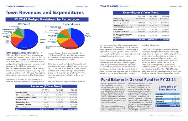 TOTAL GENERAL FUND REVENUES for FY 23-24 were $ 63.4 million . The property tax rate increased by 7.49 cents to 62.7 cents per $ 100 of assessed value . Two cents of the tax rate increase are dedicated to debt service on the $ 69 million bond package that Garner voters overwhelmingly approved in the 2021 municipal elections . In addition , the rate increase funds nine additional positions , police camera upgrades , staffing and operations for the new Caddy Road Public Safety Station , parks maintenance and facilities repairs .