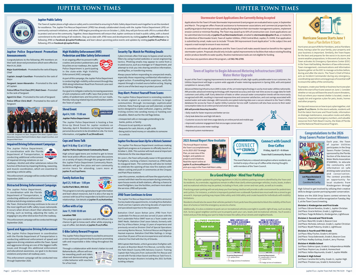 The Annual Report reviews the Town’ s accomplishments on its 2025-2027 Strategic Plan, an overview of the budget, and updates on projects and initiatives. Read the report online at jupiter. fl. us / AnnualReport or pick up a copy in the Town Hall Main Lobby.