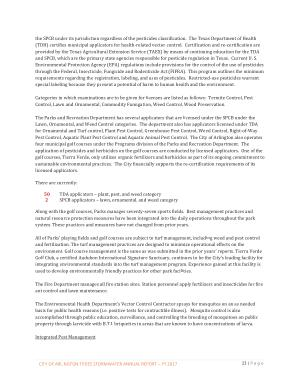 The Parks and Recreation Department has several applicators that are licensed under the SPCB under the Lawn , Ornamental , and Weed Control categories . The department also has applicators licensed under TDA for Ornamental and Turf control , Plant Pest Control , Greenhouse Pest Control , Weed Control , Right-of-Way Pest Control , Aquatic Plant Pest Control and Aquatic Animal Pest Control . The City of Arlington also operates four municipal golf courses under the Programs division of the Parks and Recreation Department . The application of pesticides and herbicides on the golf courses are conducted by licensed applicators . One of the golf courses , Tierra Verde , only utilizes organic fertilizers and herbicides as part of its ongoing commitment to sustainable environmental practices . The City financially supports the re-certification requirements of its licensed applicators .