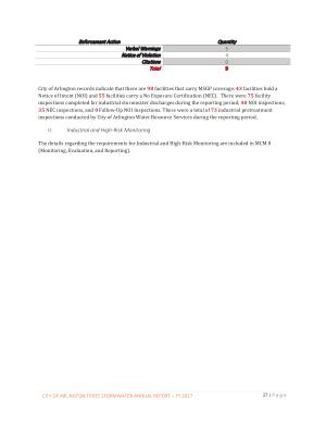 City of Arlington records indicate that there are 98 facilities that carry MSGP coverage : 43 facilities hold a Notice of Intent ( NOI ) and 55 facilities carry a No Exposure Certification ( NEC ). There were 75 facility inspections completed for industrial stormwater discharges during the reporting period ; 40 NOI inspections , 35 NEC inspections , and 0 Follow-Up NOI Inspections . There were a total of 73 industrial pretreatment inspections conducted by City of Arlington Water Resource Services during the reporting period .