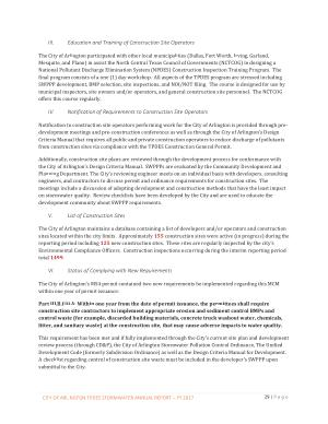 The City of Arlington participated with other local municipalities ( Dallas , Fort Worth , Irving , Garland , Mesquite , and Plano ) in assist the North Central Texas Council of Governments ( NCTCOG ) in designing a National Pollutant Discharge Elimination System ( NPDES ) Construction Inspection Training Program . The final program consists of a one ( 1 ) day workshop . All aspects of the TPDES program are stressed including SWPPP development , BMP selection , site inspections , and NOI / NOT filing . The course is designed for use by municipal inspectors , site owners and / or operators , and general construction site personnel . The NCTCOG offers this course regularly .