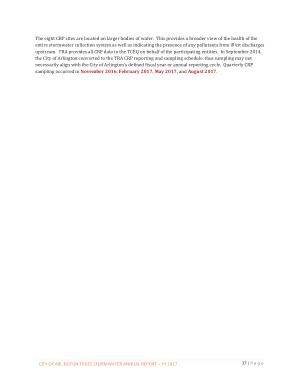 The eight CRP sites are located on larger bodies of water . This provides a broader view of the health of the entire stormwater collection system as well as indicating the presence of any pollutants from illicit discharges upstream . TRA provides all CRP data to the TCEQ on behalf of the participating entities . In September 2014 , the City of Arlington converted to the TRA CRP reporting and sampling schedule , thus sampling may not necessarily align with the City of Arlington ’ s defined fiscal year or annual reporting cycle . Quarterly CRP sampling occurred in November 2016 , February 2017 , May 2017 , and August 2017 .
