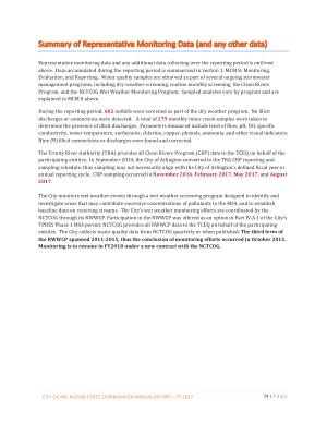Representative monitoring data and any additional data collecting over the reporting period is outlined above . Data accumulated during the reporting period is summarized in Section 1 , MCM 8 : Monitoring , Evaluation , and Reporting . Water quality samples are obtained as part of several ongoing stormwater management programs , including dry weather screening , routine monthly screening , the Clean Rivers Program , and the NCTCOG Wet Weather Monitoring Program . Sampled analytes vary by program and are explained in MCM 8 above .