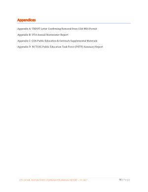 Appendix A : TXDOT Letter Confirming Removal from COA MS4 Permit Appendix B : UTA Annual Stormwater Report Appendix C : COA Public Education & Outreach Supplemental Materials Appendix D : NCTCOG Public Education Task Force ( PETF ) Summary Report
