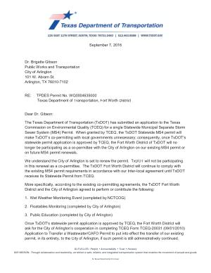 Once TxDOT ' s statewide permit application is approved by TCEQ , the Fort Worth District will ask for the City of Arlington ’ s cooperation in completing TCEQ Form TCEQ-20031 ( 09 / 01 / 2010 ) Application to Transfer a Wastewater / CAFO Permit to put into effect the transfer of our existing permit , in its entirety , to the City of Arlington , if such permit is still administratively continued .