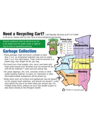 Need a Recycling Cart ? Call Republic Services at 817-317-2000 or fill out an “ Issues with my Cart ” form at www . arlingtontx . gov / recycle