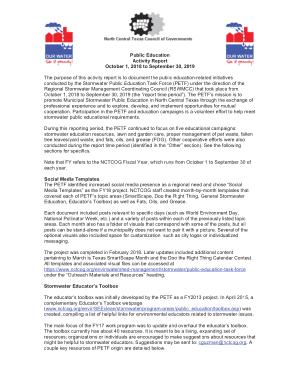 The purpose of this activity report is to document the public education-related initiatives conducted by the Stormwater Public Education Task Force ( PETF ) under the direction of the Regional Stormwater Management Coordinating Council ( RSWMCC ) that took place from October 1 , 2018 to September 30 , 2019 ( the “ report time period ”). The PETF ’ s mission is to promote Municipal Stormwater Public Education in North Central Texas through the exchange of professional experience and to explore , develop , and implement opportunities for mutual cooperation . Participation in the PETF and education campaigns is a volunteer effort to help meet stormwater public educational requirements .