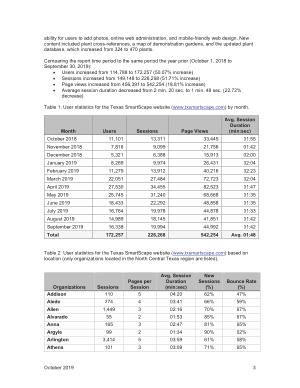 September 30 , 2019 ): � Users increased from 114,788 to 172,257 ( 50.07 % increase ) � Sessions increased from 149,148 to 226,268 ( 51.71 % increase ) � Page views increased from 456,391 to 542,254 ( 18.81 % increase ) � Average session duration decreased from 2 min . 20 sec . to 1 min . 48 sec . ( 22.72 % decrease )