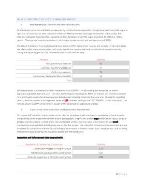 The City requires Stormwater Pollution Prevention Plans ( SWPPPs ) for all building and construction permit applications greater than one acre . The city ’ s permitting process requires BMPs for erosion and sediment controls to protect water quality for all construction disturbances including those less than one acre . During the reporting period , the Environmental Management received 125 reviewed and approved PDS SWPPPs , construction plans , site notices , and / or SWPPP contact sheets as part of the construction application process .
