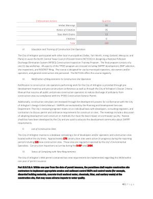 The City of Arlington participated with other local municipalities ( Dallas , Fort Worth , Irving , Garland , Mesquite , and Plano ) in assist the North Central Texas Council of Governments ( NCTCOG ) in designing a National Pollutant Discharge Elimination System ( NPDES ) Construction Inspection Training Program . The final program consists of a one ( 1 ) day workshop . All aspects of the TPDES program are stressed including SWPPP development , BMP selection , site inspections , and NOI / NOT filing . The course is designed for use by municipal inspectors , site owners and / or operators , and general construction site personnel . The NCTCOG offers this course regularly .