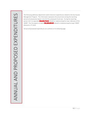 The following addresses department and / or divisional expenditures related to the Stormwater Management Program . The information represents the actual costs during the reporting period and proposed program costs for the subsequent fiscal year . During the reporting period , the City expended $ 23,008,713.82 related to implementing the major elements of the SWMP . The City expects to spend $ 31,830,093.69 related to implementing the major SWMP elements in FY 2019 .