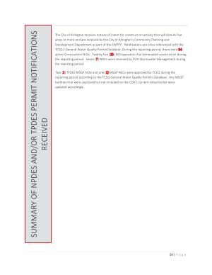 The City of Arlington receives notices of intent for construction activity that will disturb five acres or more and are received by the City of Arlington ’ s Community Planning and Development Department as part of the SWPPP . Notifications are cross referenced with the TCEQ ’ s General Water Quality Permit Database . During the reporting period , there were 34 active Construction NOIs . Twenty-five ( 25 ) NOI operators that terminated construction during the reporting period . Seven ( 7 ) NOCs were received by COA Stormwater Management during the reporting period .
