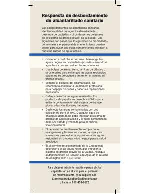 • Si el servicio de alcantarillado de la Ciudad está obstruido o si las aguas residuales ingresan al �������������������������������������������������� al departamento de Servicios de Agua de la Ciudad de Arlington al 817-459-5900 .